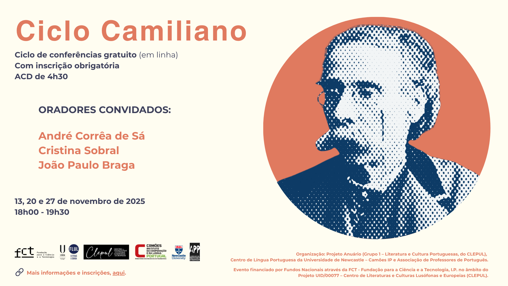 Para assinalar o bicentenário do nascimento de Camilo Castelo Branco, o Grupo 1 – Literatura e Cultura Portuguesas do CLEPUL (FLUL), o Centro de Língua Portuguesa da Universidade de Newcastle – Camões IP e a Associação de Professores de Português promovem um ciclo de três conferências online, para as quais convidaram André Corrêa de Sá (University of California – Santa Barbara), Cristina Sobral (Universidade de Lisboa) e João Paulo Braga (CEFH-Universidade Católica Portuguesa).
