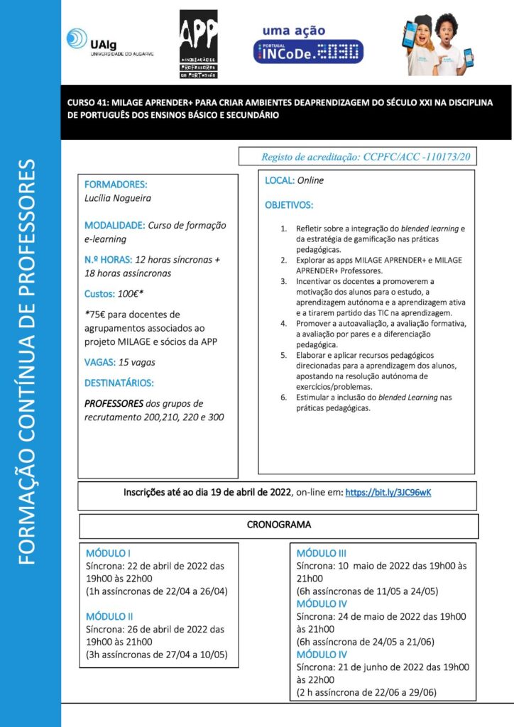 MILAGE APRENDER+ para criar ambientes de aprendizagem do século XXI na disciplina de Português dos ensinos básico e secundário – curso de formação